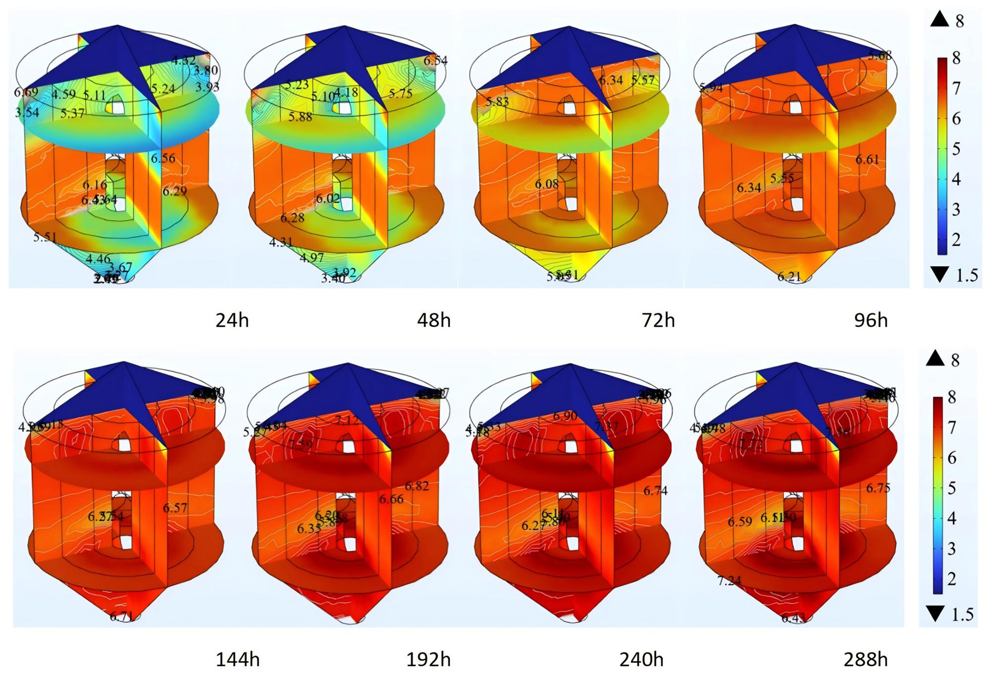 針對糧食產地儲藏品質與加工需求不匹配、綜合效益不高等問題,重點圍繞糧堆通風濕熱傳遞規律不明確、糧堆霉菌變化過程難預測、儲藏工藝參數調控不均衡等關鍵技術問題,我院農產品產地初加工創新團隊研究構建了高水分玉米糧堆濕熱傳遞及霉菌生長模型,實現了二者的同時空預測,并基于通風效果評估,得到適宜的通風工藝及參數,為確保儲藏通風工藝參數均衡調控提供理論和技術支撐。